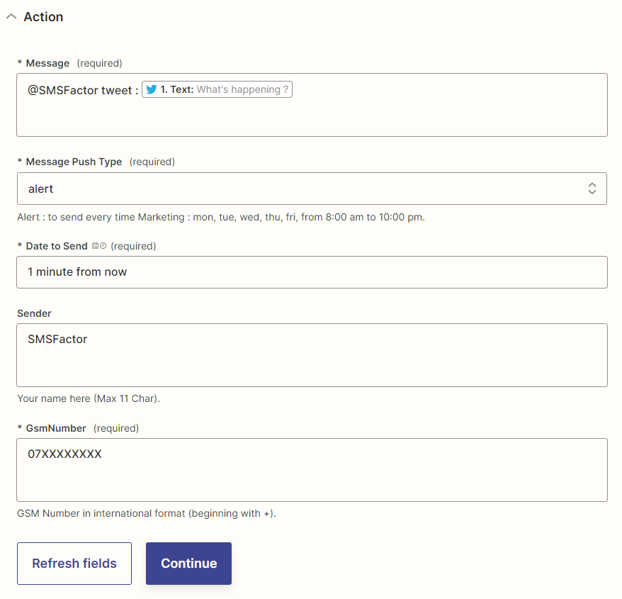 Indiquez le compte SMSFactor à utiliser dans ce zap. S'il s'agit de votre première fois alors identifiez vous via "+Connect new account". Poursuivez vers la prochaine étape.