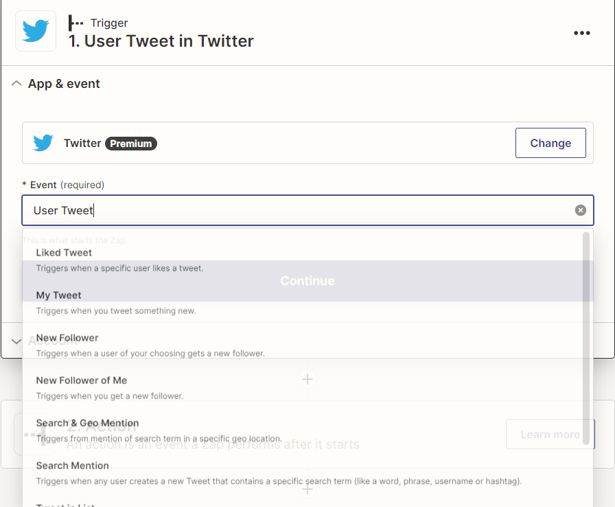 Parmi la liste déroulante, choisissez un déclencheur. Dans ce tutoriel nous choisissons "User Tweet" (tweet d'une personne en particulier).