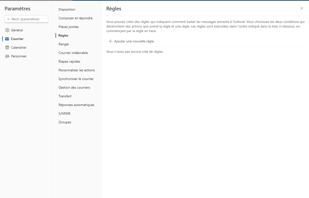 Une fois votre configuration finalisée, il est maintenant temps d'automatiser l'envoi de vos SMS. Vous devez vous rendre sur votre messagerie pour créer une « règle » qui permet la redirection du mail reçu vers l'adresse e-mail de votre choix (l’adresse e-mail de votre configuration mail to SMS). Pour continuer l’exemple de ce tutoriel, nous utilisons Outlook mais le fonctionnement est très similaire sur d’autres messageries.