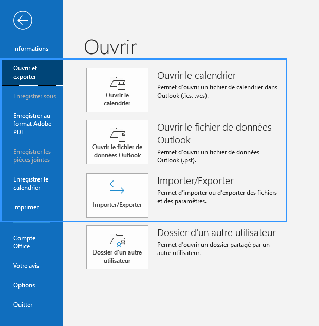 Dans le dossier « fichier » de votre calendrier, commencez par cliquer sur « ouvrir et exporter » puis sélectionnez ensuite « Importer / Exporter ».